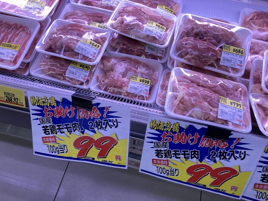 チラシを見て、実際に「BASIC松阪川井町店」に行ってみました。鶏モモが本当に安い! こちらは2枚入りの価格ですが、3枚以上買うと、もっとお得です。