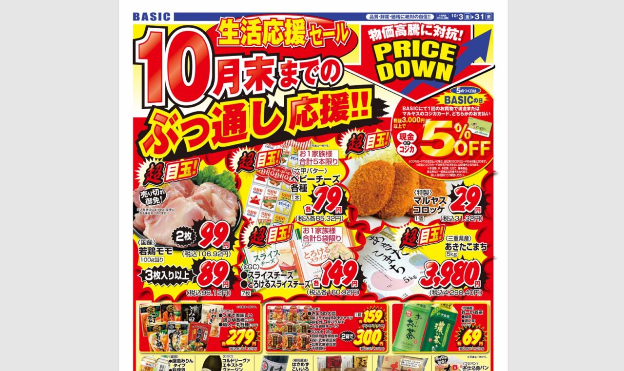 BASICの生活応援セールは、毎日ほしい物が本当に安くなっていました! なおこちらのセールは2025年10月3日(金)~31日(金)までぶっ通しで開催中。BASIC合同のセールですので、松阪市内では松阪川井町店と松阪店の各店舗で開催中です。皆さんもぜひお買い物に行ってみてくださいね!