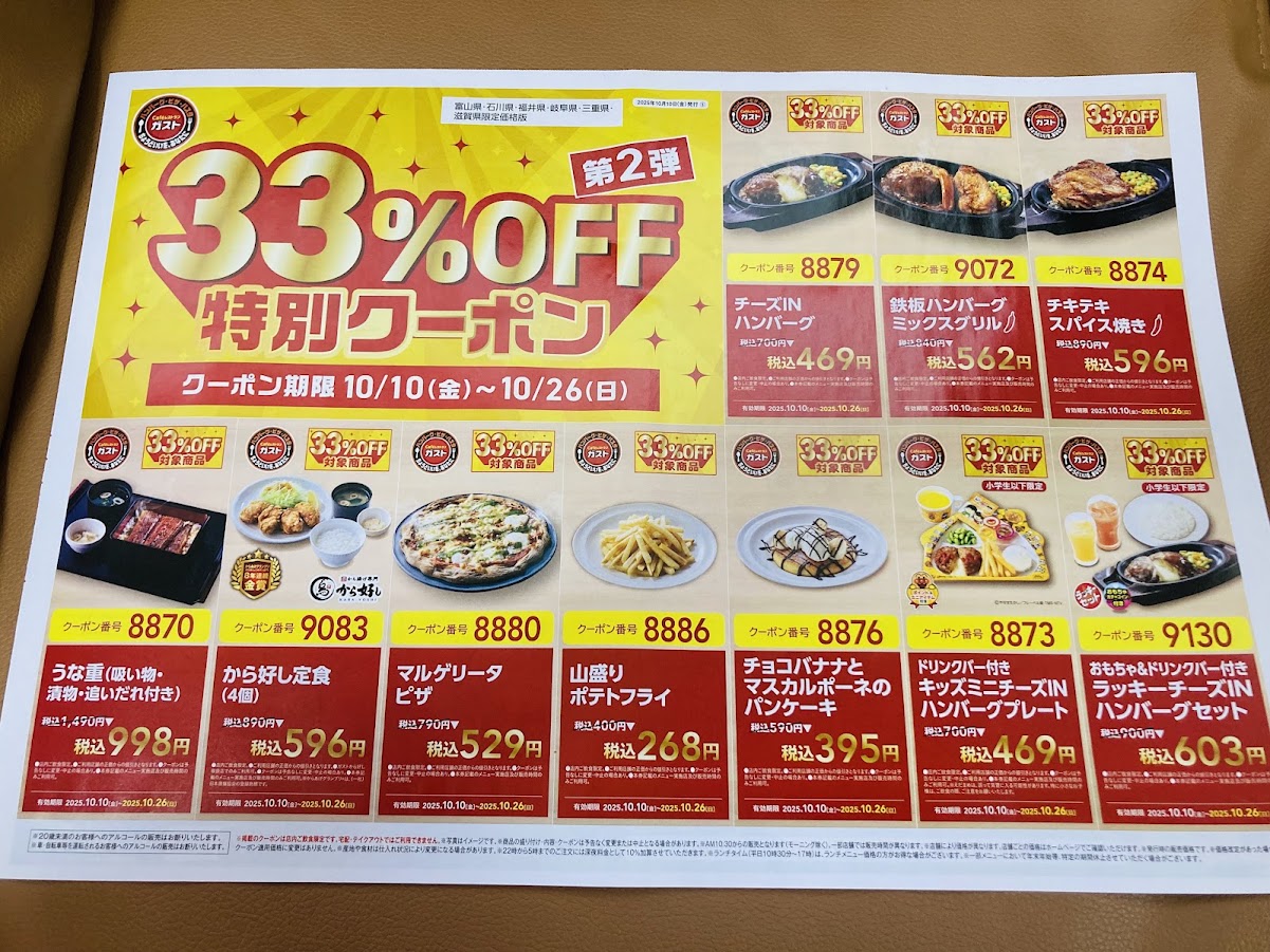 Cafeレストラン「ガスト」で、10月10日(金)~10月26日(日)まで使える、33%OFF特別クーポンのキャンペーンが行われています。