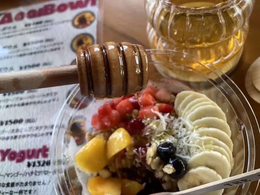 こちらのアサイーボウルは甘すぎないのが嬉しい。ハチミツをお好みで好きなだけ入れることができます。しかもこの容器は、絵本みたいなハニーポット! これだけでもテンション上がりましたよ。