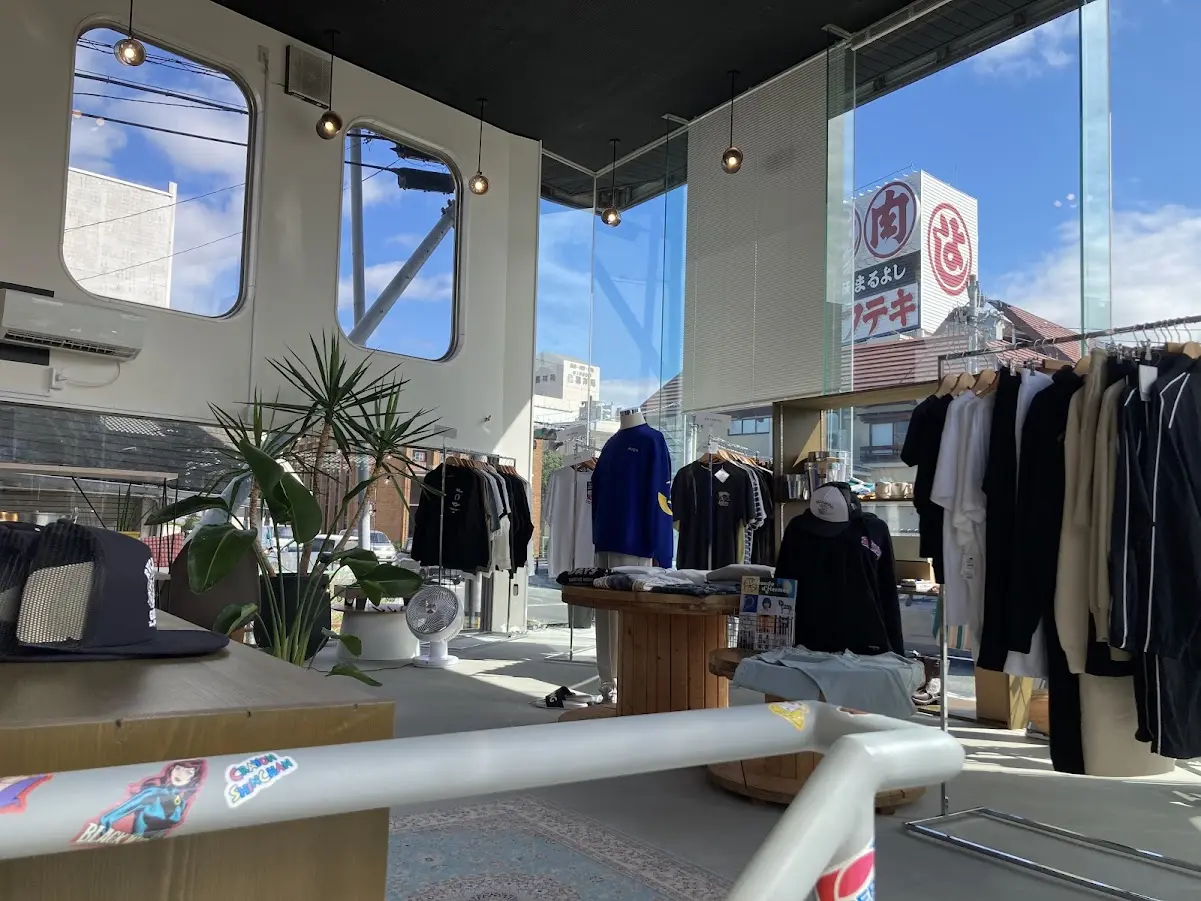 こちらは洋服や雑貨も販売されています。大きなガラスに青空が映えて、店内は開放感満点。サーフブランドやアメリカ雑貨などを取り扱っていますよ。
