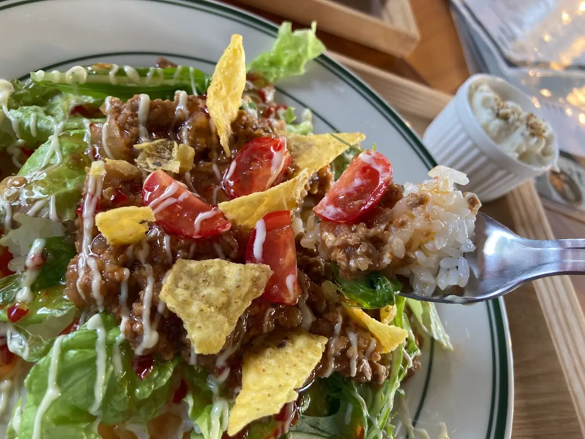 タコライスは彩りも良く、華やかで栄養バランスもとれています。スパイシーなのかと思いきや、甘めの味付けで、お子さんでも食べられそうです。