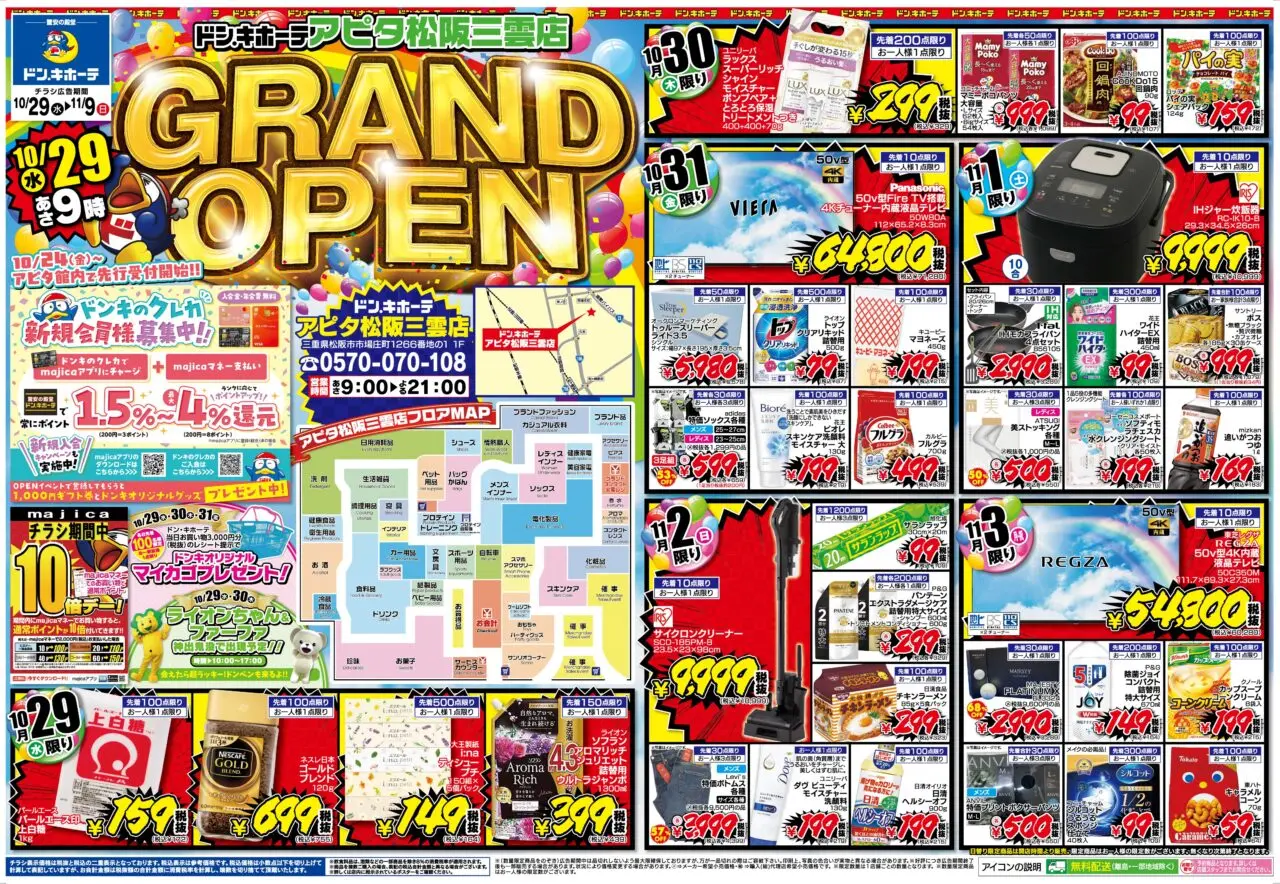 2025年10月29日(水)アピタ松阪三雲店1階に、いよいよドンキがグランドオープン! そのOPENチラシの情報をいただきましたのでご紹介します。