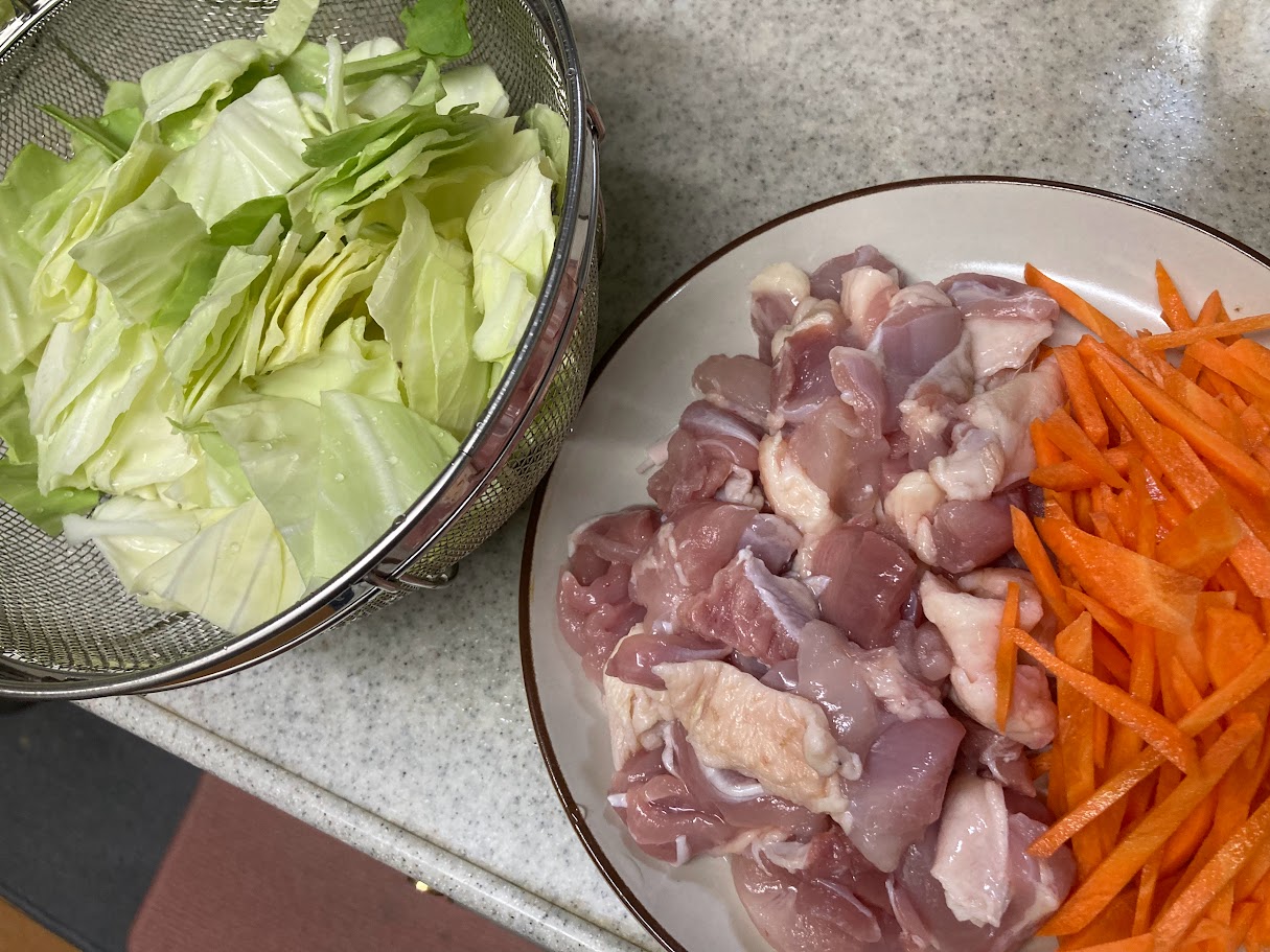 作り方は、まず鶏肉、キャベツなどの野菜を油をひいたフライパンで炒めます。鶏肉にはしっかり火を通しましょう。