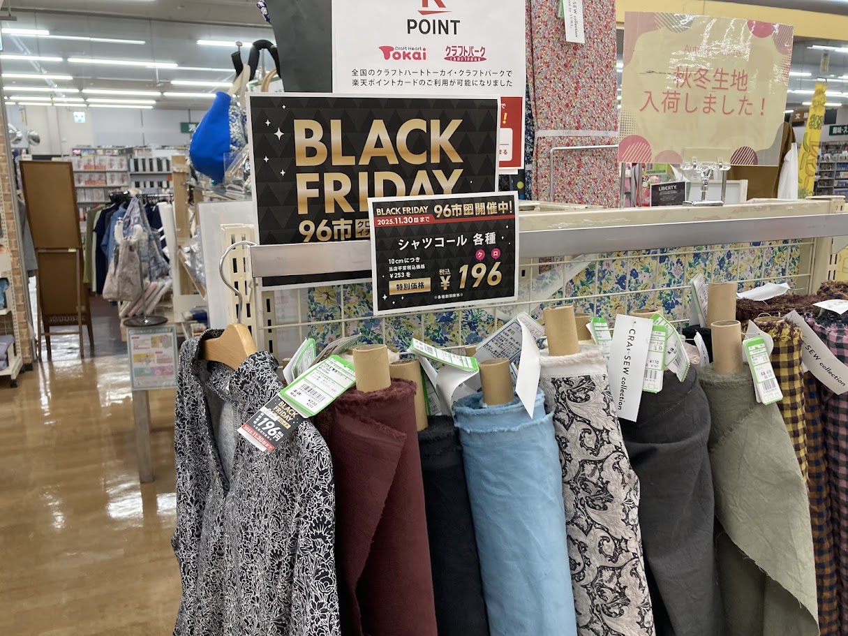 96(クロ)市として、こちらの布地などもお得な価格で販売中。ブラックフライデーのセールは2025年11月30日までとなっていますので、急いでチェックしましょう!