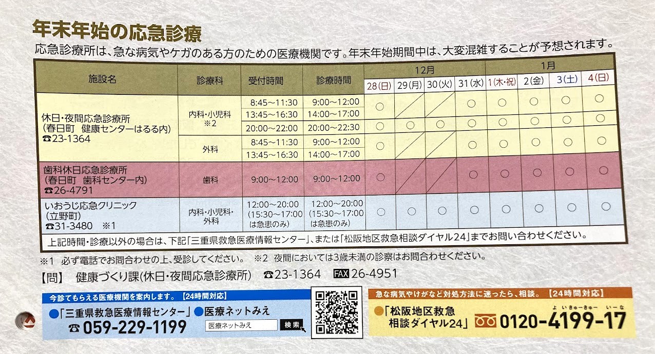 続いては、必ずチェックしておきたい、年末年始の応急診療について。休日夜間応急診療所(春日町)、歯科休日応急診療所(春日町)、いおうじ応急クリニック(立野町)の診療スケジュールが、同じく広報まつさか12月号に掲載されています。急病になった時に、どこが対応できるのが確認できるので、保存しておきたいですね。