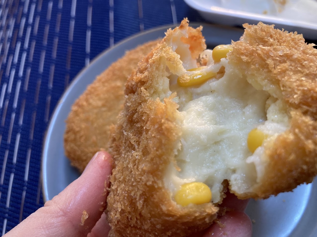 続いて仲間たちも、割ってご紹介。こちらは「コーンクリームコロッケ」税込150円。洋食風で少し粗目のざくっとしたパン粉が、とろーりクリーミーなコーンクリームを包んでいます。