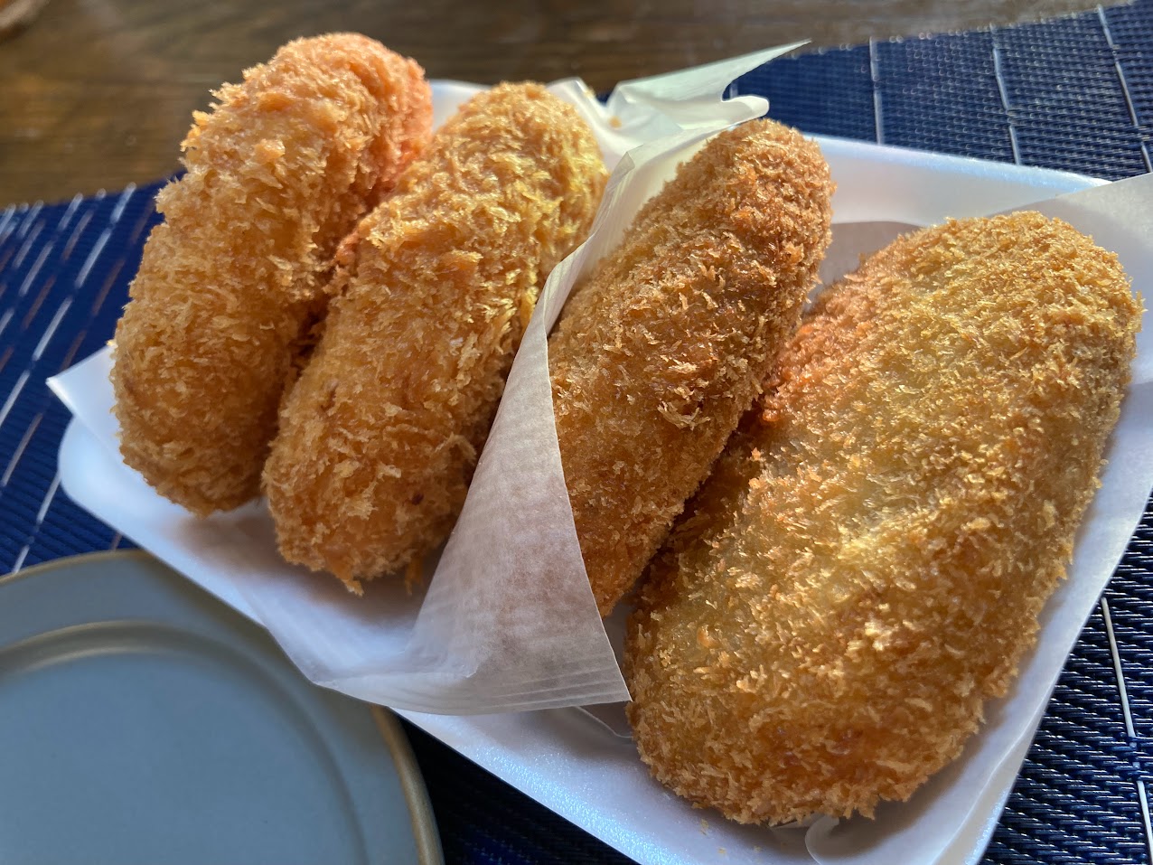揚げたてをトレーに入れてもらい、走る!…とにかく急いで食卓へ! そして食卓に出したのがこちら。 サクッとあがった、揚げたて&黄金色に輝く「丸茂食品」のコロッケです☆