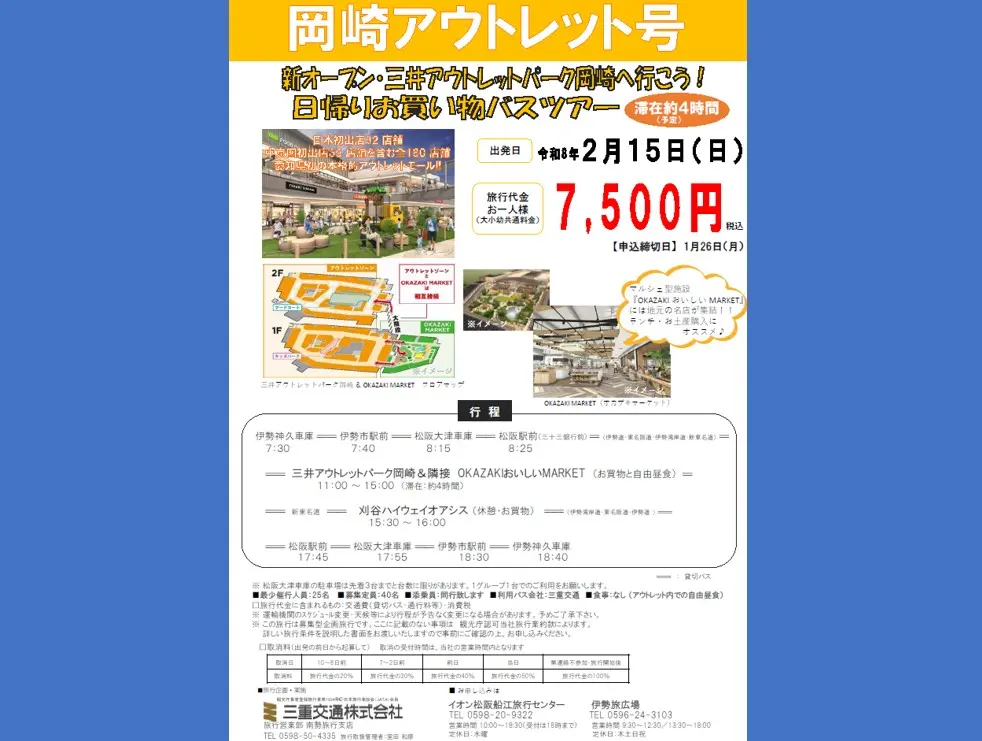 なお、 チラシには最少催行人数25名となっていますが、今回は赤字覚悟で企画しているコース。人数が少なくても出発が決まっているらしいので、安心してお申し込みを。「岡崎アウトレットへ行こう!日帰りお買い物バスツアー!」の申込締め切りは2026年1月26日(月)まで。気になった方は、店舗までご連絡してみてくださいね!