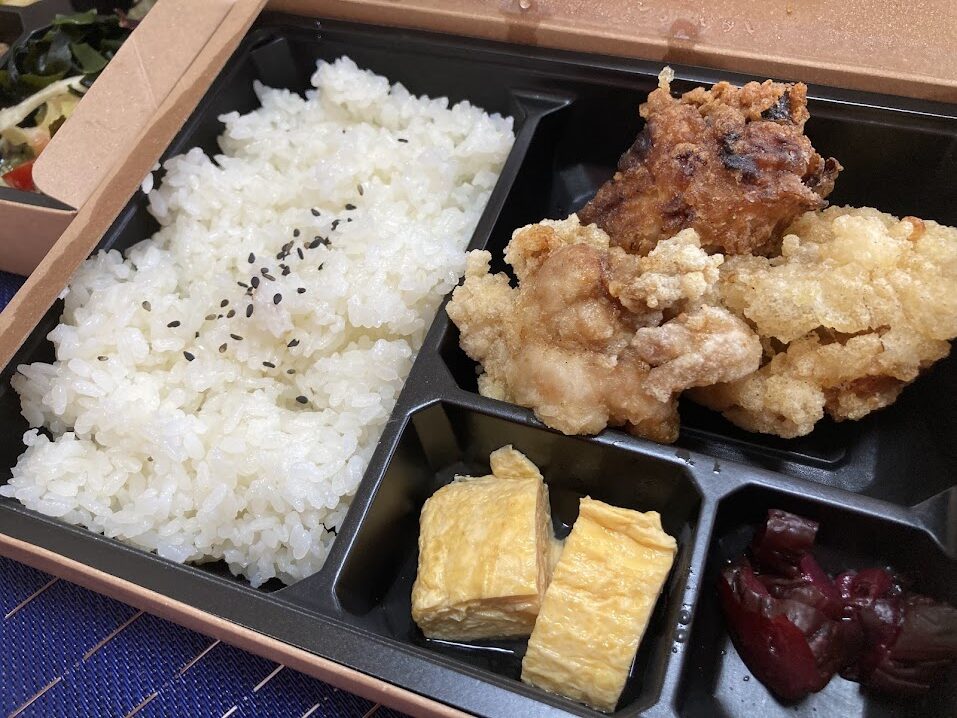 早速、お弁当を開けてみます。私が購入したのはとりのカラアゲ弁当。1段目はメインの唐揚げ、出汁巻き、しば漬けとごはん。