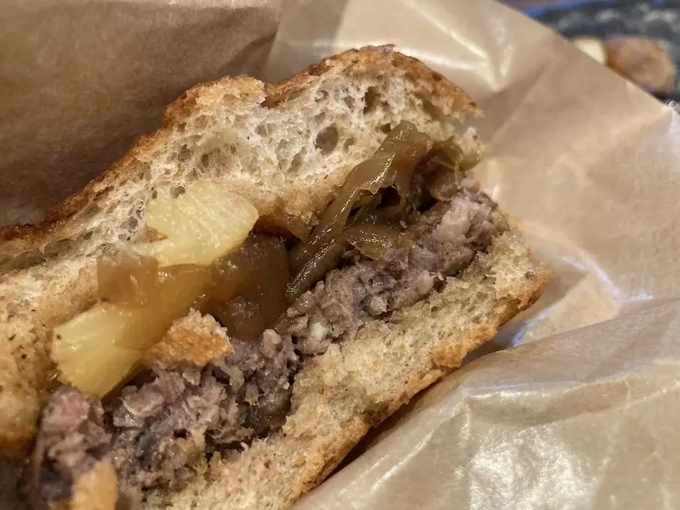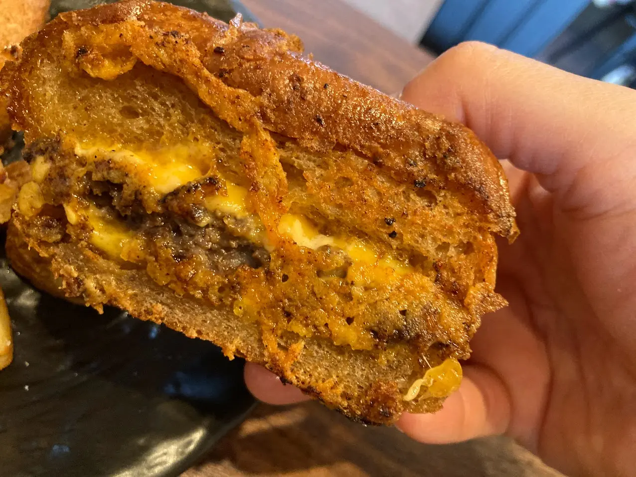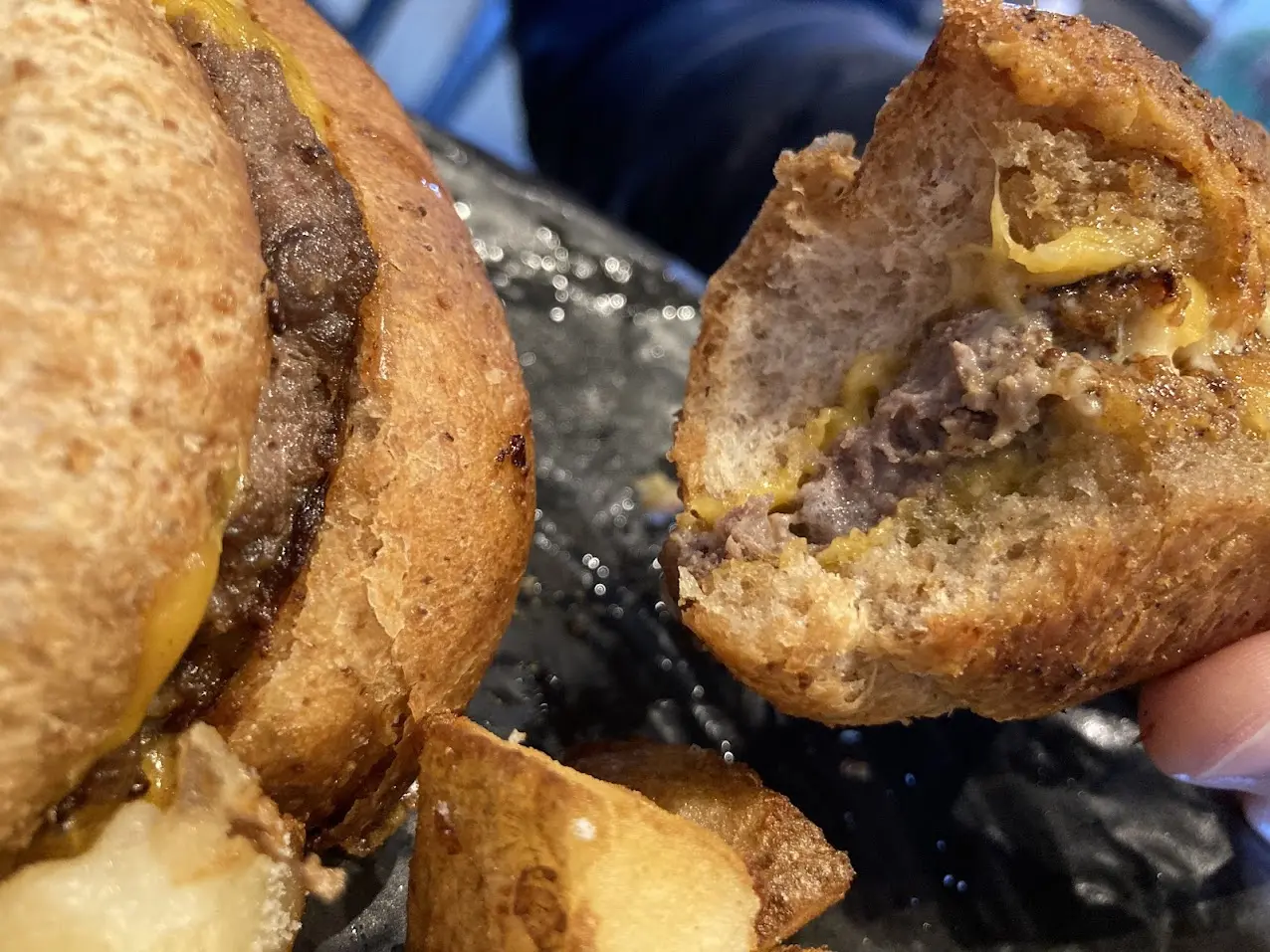 断面にもお肉の旨味が感じられ、焼かれたチーズがとても香ばしい! とても濃厚なハンバーガーでしたよ。