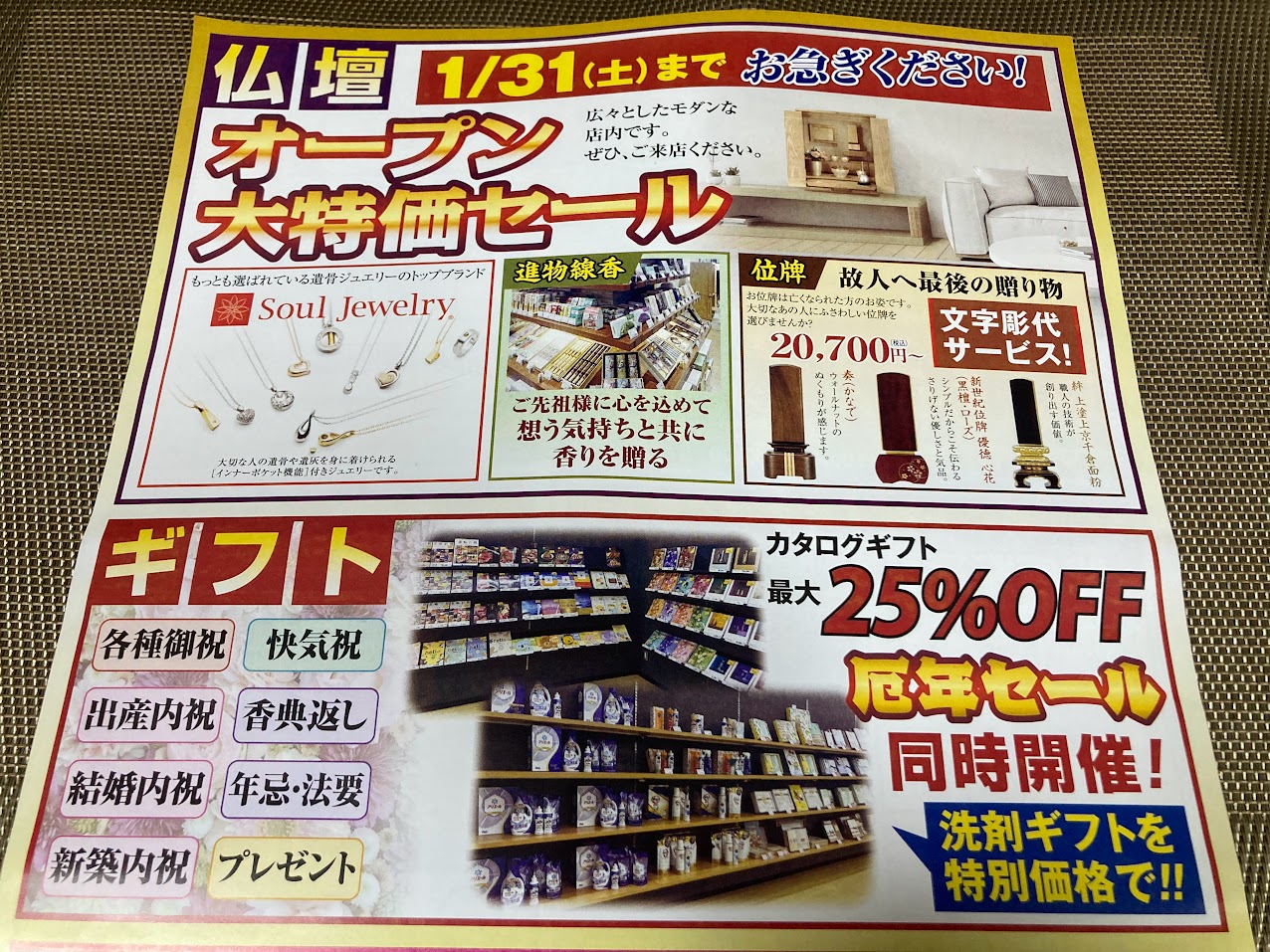 また1月31日(土)までは、オープンを記念して仏壇やギフトの特価セールを開催中ですよ!