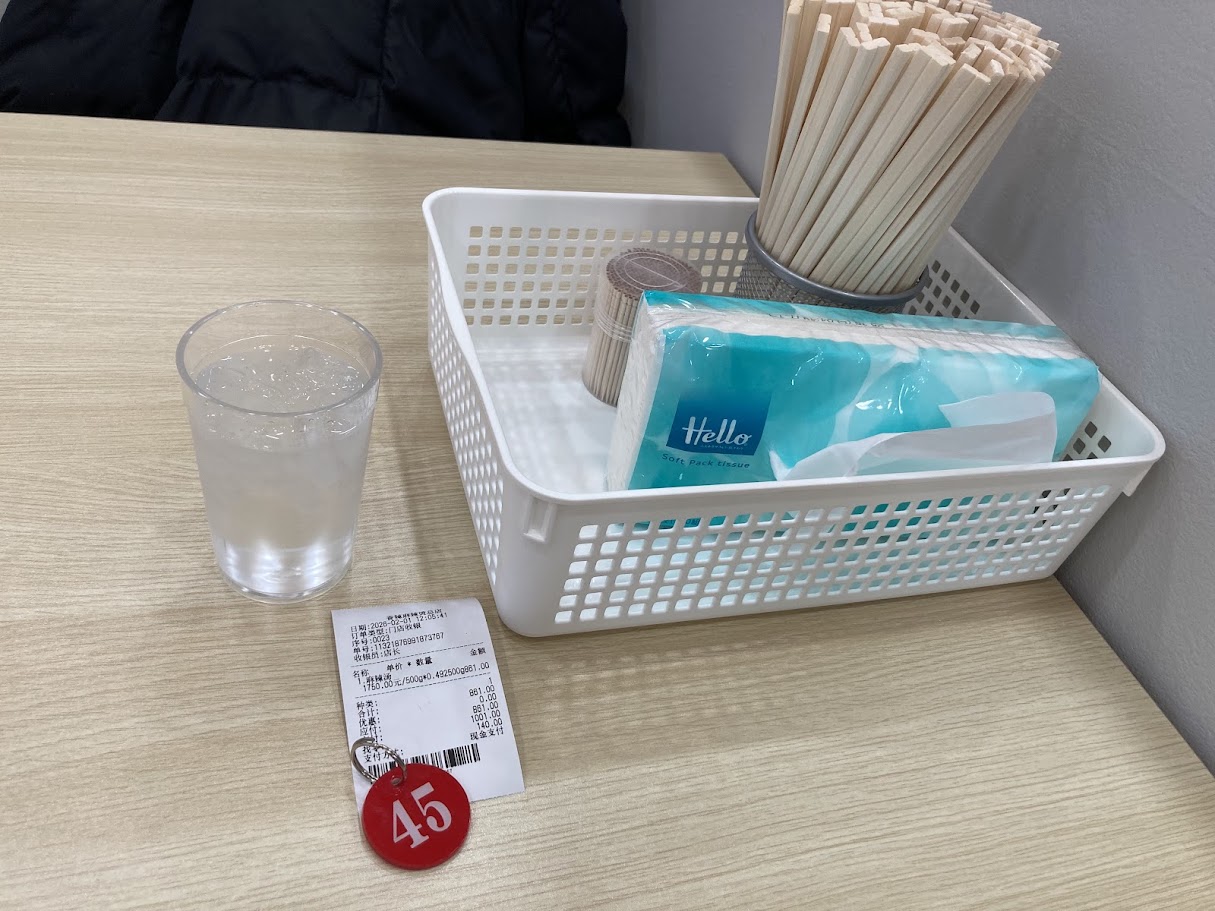 レジで会計をしたら、番号札を受け取り、具材が煮込まれるのをテーブルで待ちます。私が選んだ具材で、861円(税込)でした。