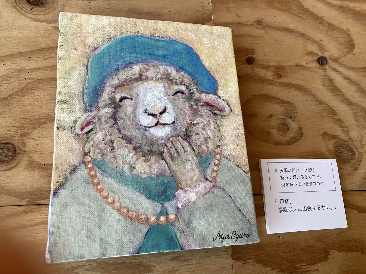 ヒツジの奥様は、天国に持っていきたいものは「口紅。素敵な人に出会えるかも。」と答えます。これらは、映画や小説でも印象的なやり取りや、身近な人がつぶやいたセリフなど、作家が忘れられない言葉を記しているそう…絵画の動物たちが本当に言いそうですよね!