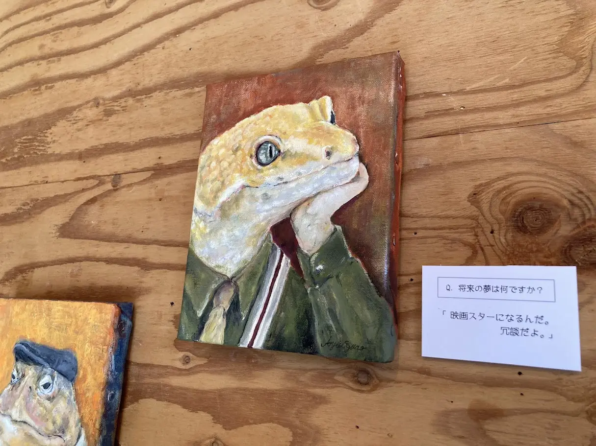 絵画の横に貼られた白いカード、そこには絵のタイトルではなく、何か言葉が書かれているようです。たとえばこちらのトカゲは「映画スターになるんだ。冗談だよ。」将来の夢を尋ねられて、そう答えます。
