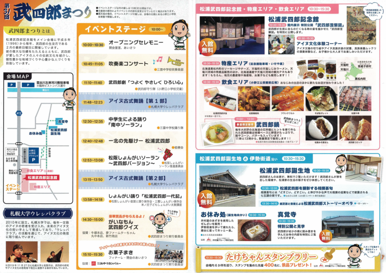 当日のプログラムはこちら。イベントステージや、物産・飲食エリアなど盛りだくさんです。また、この日は松浦武四郎記念館・誕生地が入場無料になりますよ。