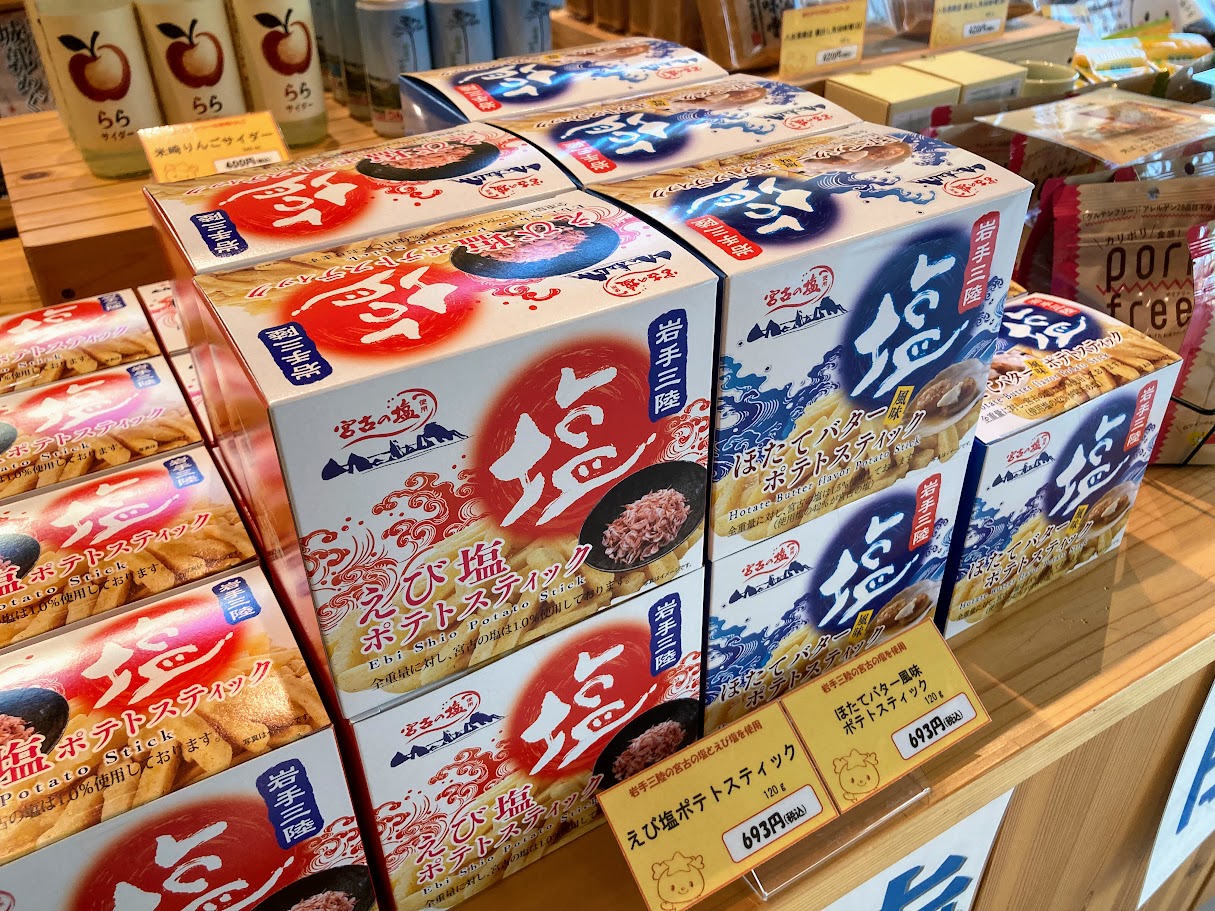 物産展では、かわいらしいりんごサイダーや、海鮮風味が活きたポテトスティックなど、陸前高田市の名物に出会えます。