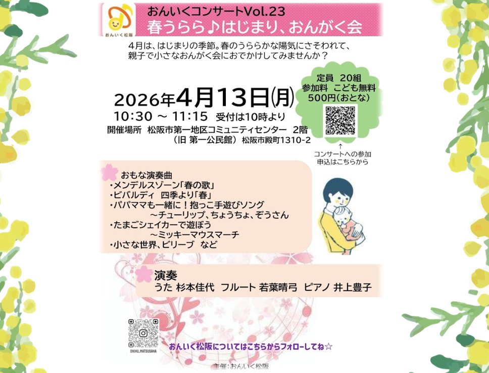 2026年4月13日(月)松阪市殿町の第一コミュニティセンター(旧第一公民館)で、小さなお子さんと親子・家族を対象に「おんいくコンサート」が開催されます。