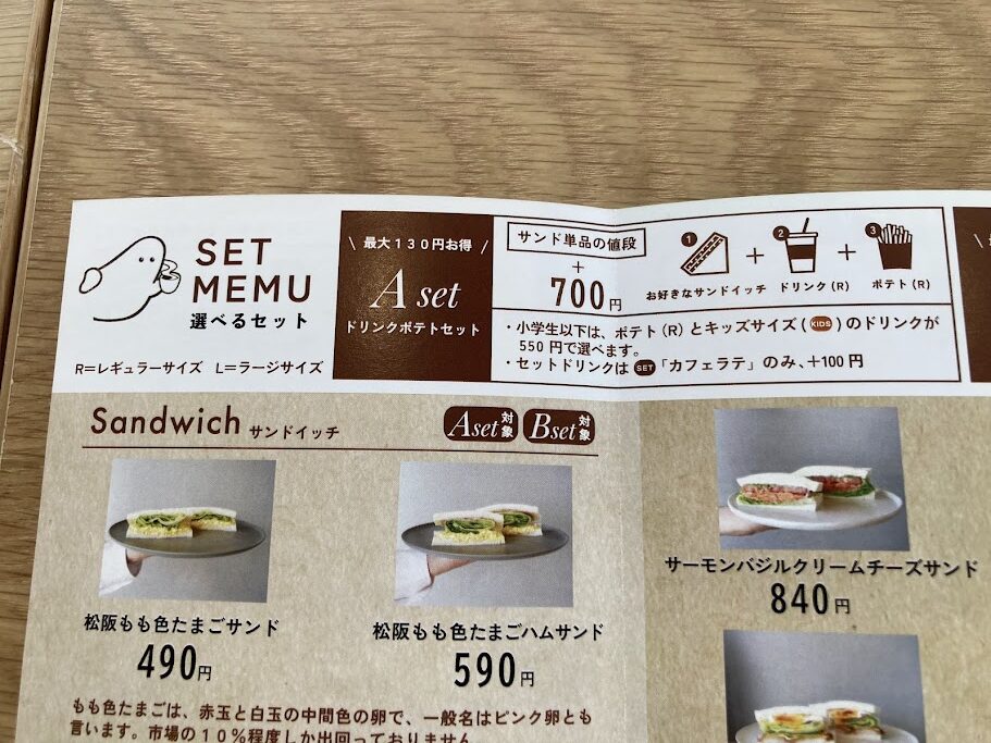 Aセットはサンド単品の値段に+700円。ポテト(R)とドリンク(R)が付いてきます。うれしいキッズドリンクもありますよ。