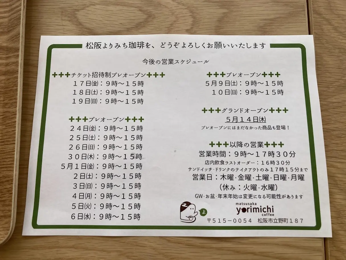 「松阪よりみち珈琲」プレオープンのスケジュールはこちら。プレオープン期間中は誰でも利用できますので、ぜひ立ち寄ってみて! そしてお店のグランドオープンは2026年5月14日(木)です。